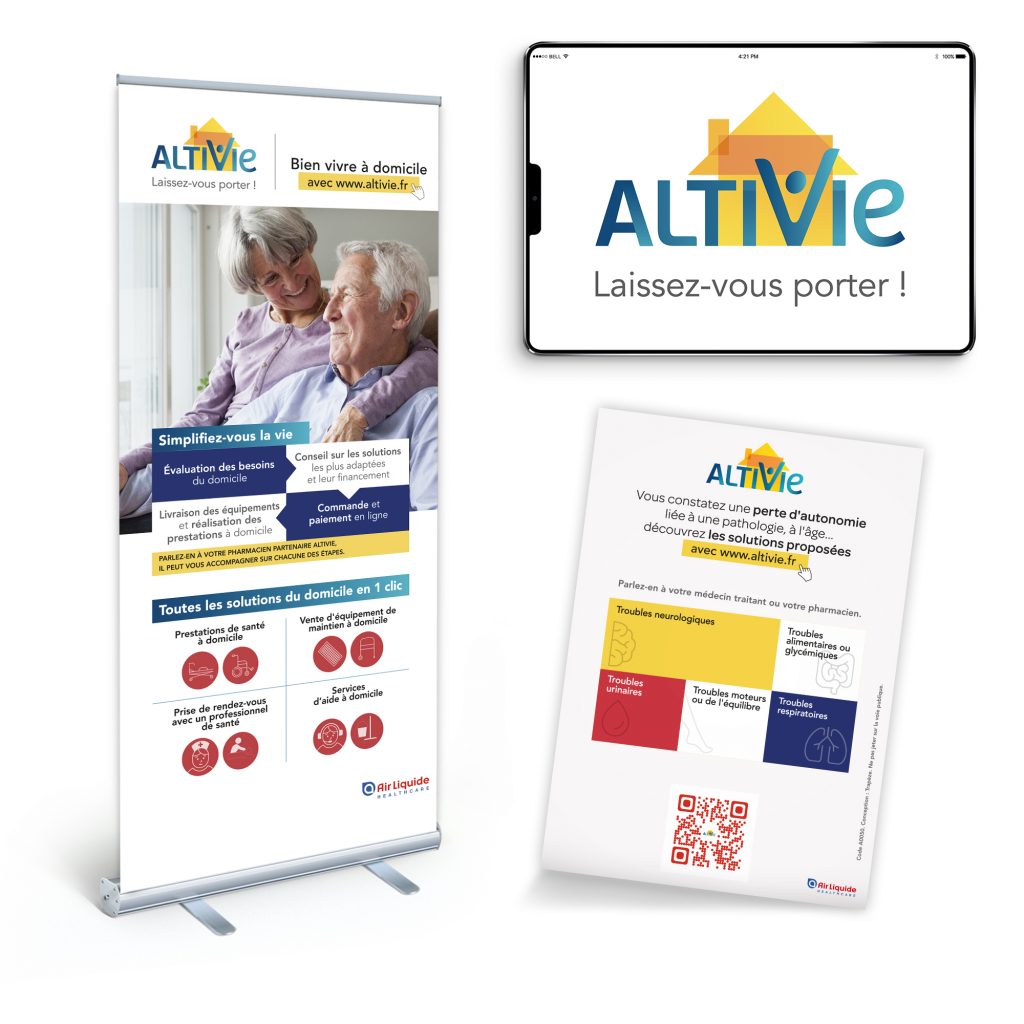Dans le prolongement de cette création identitaire, Trapèze développe tout l’univers de marque capitalisant sur des formes géométriques et les 4 couleurs primaires. Leaflet, poster, kakémono… création des différents outils de communication à disposition des professionnels de santé, pharmaciens et patients permettant de valoriser l’offre et les solutions ALTIVIE.