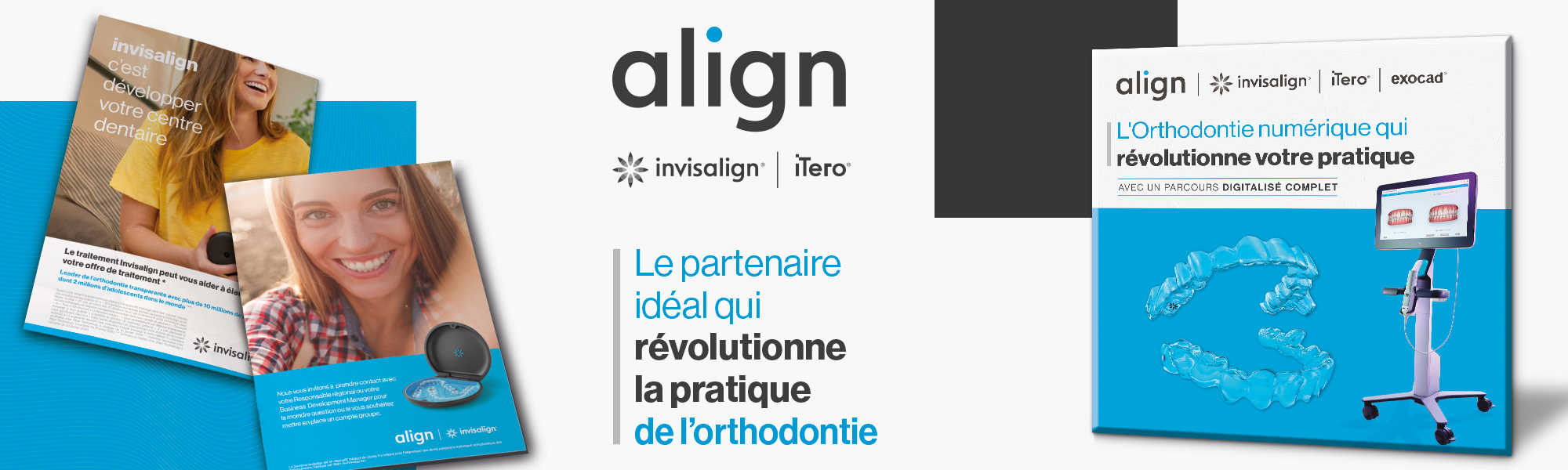 Développement de supports d’édition et POSM BtoB pour la marque Align dans le cadre de salons professionnels (bâche) à destination des dentistes et orthodontistes.