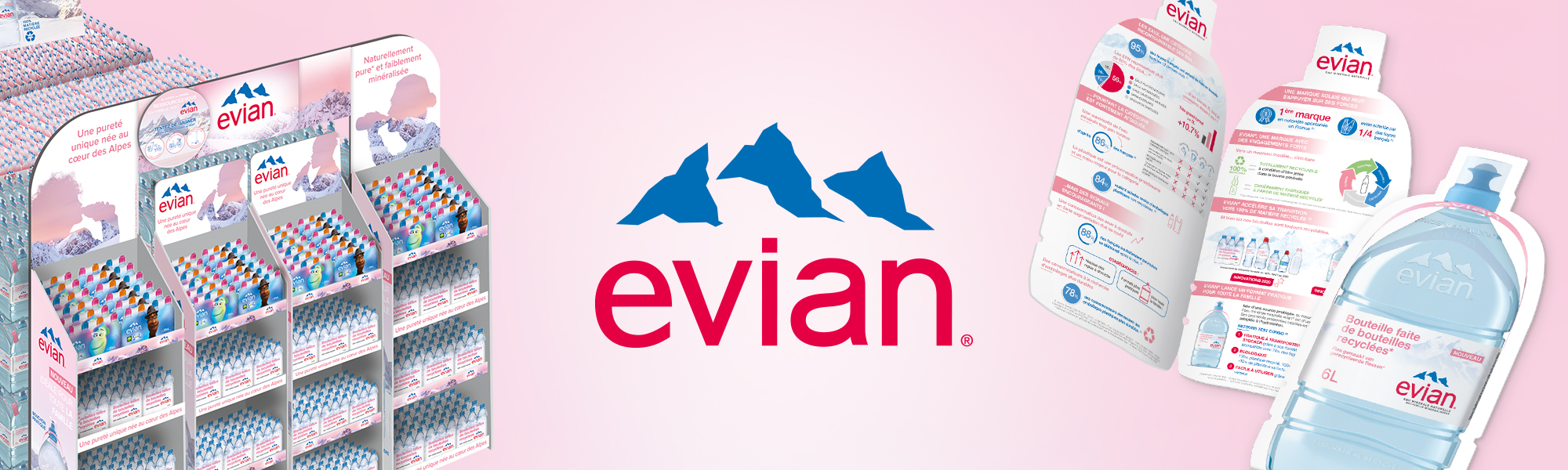 Déploiement d’un kit PLV/édition relatif au lancement de la bouteille evian 6 litres 100% matière recyclée avec son bouchon pratique pour toute la famille. Accompagnement de ce lancement avec la campagne « Drink true » evian.