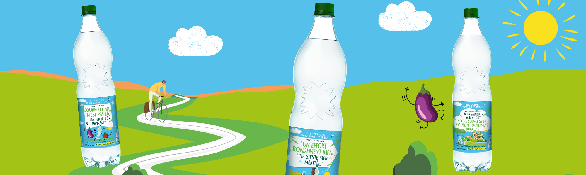 Pour illustrer ce nouveau langage de marque. Trapèze crée tout un univers graphique mettant en scène la bouteille de Salvetat de façon ludique et « pétillante », au sein d’une gamme de 3 nouvelles étiquettes.