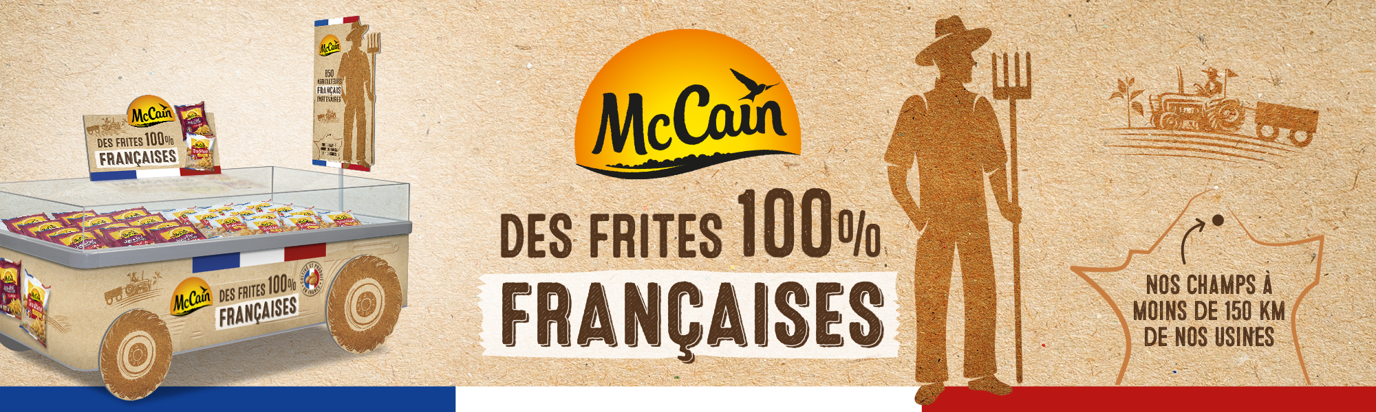 Dans le cadre de son temps fort de la rentrée, McCain souhaite développer un KV mettant en avant son offre Core business et ses engagements RSE. Discours et univers graphique capitalisant sur les assets Made in France de McCain : fond kraft et univers illustratif mettant en valeur les 800 agriculteurs partenaires. Pour créer l’évènement, Trapèze habille les frigos réfrigérés façon tracteur, avec des pâtes à freins en forme de roues !