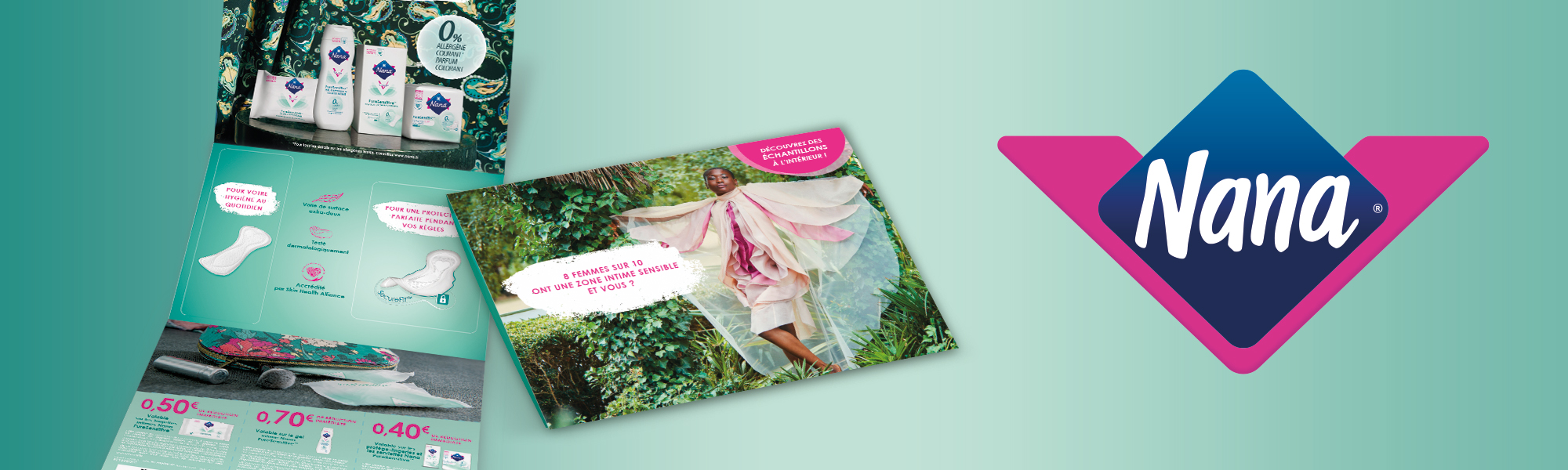 Création d’un leaflet échantillonnage permettant de faire découvrir la nouvelle gamme de serviettes et protège-lingeries Nana PureSensitive pour les peaux sensibles et les consommatrices en quête de naturalité !